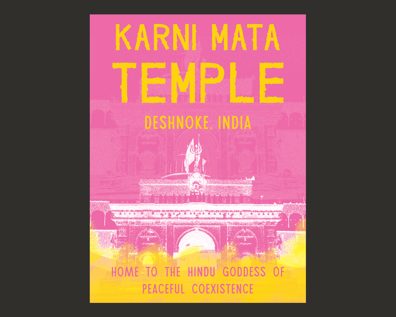 Karni Mata Temple consists of a 15” x 20” poster created in Photoshop and features Deshnoke, a custom typeface created in Illustrator. The poster combines contemporary typography and color with historical imagery to pay homage to the Hindu goddess Karni Mata, as well as the history and music associated with the culture.